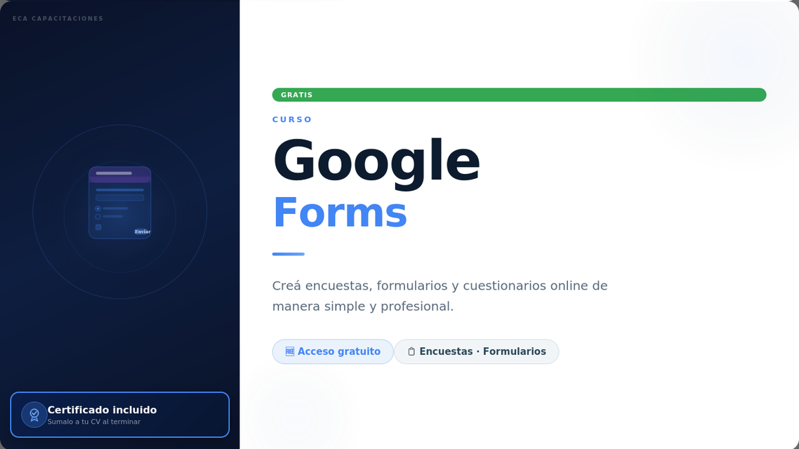 ECA Capacitaciones te trae este curso gratuito para que puedas conocer esta fabulosa herramienta de Google para crear todo tipo de formularios.